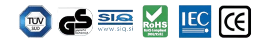 Потврда за квалитетот се бројните сертификати од словенскиот институт за квалитет и метрологија: SIQ, CE, IEC, CB, LVD, ROHS и германските институти: GS, TUV како и повратните информации од бројни задоволни клиенти.