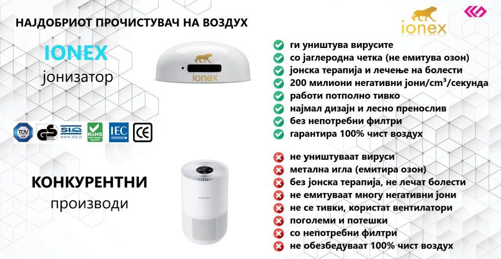 Јонизаторот IONEX е единствениот производ што го прочистува целосно воздухот и придонесува за подобрување на општата здравствена состојба.