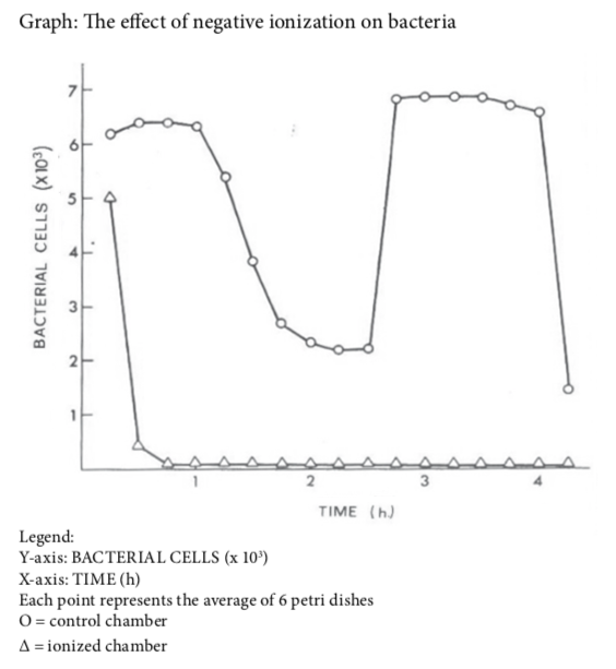 Познат е фактот дека биоактивноста на негативните јони е каталитичка по природа (катализатор е супстанца која ја менува брзината на хемиската реакција без самата да се промени или да стане составен дел од производот на реакцијата), што значи дека не зависи од циркулаторниот или нервниот систем, како што е потврдено со истражување спроведено на култури од бактерии и клетки. Изложувањето на суспензии на стафилококи на негативна јонизација го преполовува бројот на живи бактерии во рок од четири до шест часа. Слични ефекти беа забележани кај бактеријата Neurospora crassa од Fuerst и Ball и во Penicillium notatum од Прат и Бернард. Секако, овие резултати го привлекоа вниманието на прехранбената индустрија, која започна успешно да користи воздушна јонизација во областите за складирање зеленчук во големите трговски центри. Производството на доволен број негативни јони во станбен или работен простор автоматски го намалува бројот на бактерии. Прво, бактериите го формираат јадрото на кондензатот што се отстранува и второ, им се дава смртоносна доза електрична енергија од електростатското полнење. Иако ова не го дезинфицира воздухот 100%, количината на бактерии е значително намалена, што резултира со многу помал ризик од инфекција.