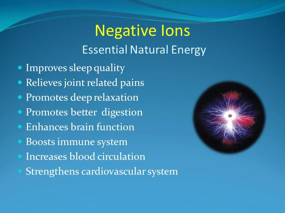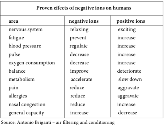 Покрај промовирањето на апсорпцијата на кислородот, негативните јони делуваа и како регулатори на автономниот нервен систем. Затоа, вдишувањето на воздухот збогатен со негативни јони резултираше со закрепнување на силата и спокојството, или со други зборови чувство на вистинска благосостојба. Придавките позитивни и негативни го означуваат само поларитетот на јоните, но нивните ефекти се всушност спротивни на значењето на зборовите: позитивните јони се генерално штетни, а негативните се корисни и затоа се нарекуваат и „животно есенцијални“.