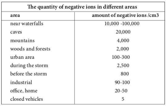 Споредувајќи ги концентрациите на негативни јони по cm³ во различни области во природата, може да заклучиме дека на места каде што нивото на негативни јони е високо, се чувствуваме најудобно, опуштено и најсилно. Во близина на водопадите има околу 50.000 негативни јони по cm³, до езеро 4.000 негативни јони/cm³, додека воздухот во затворен простор често држи под 200 негативни јони/cm³.