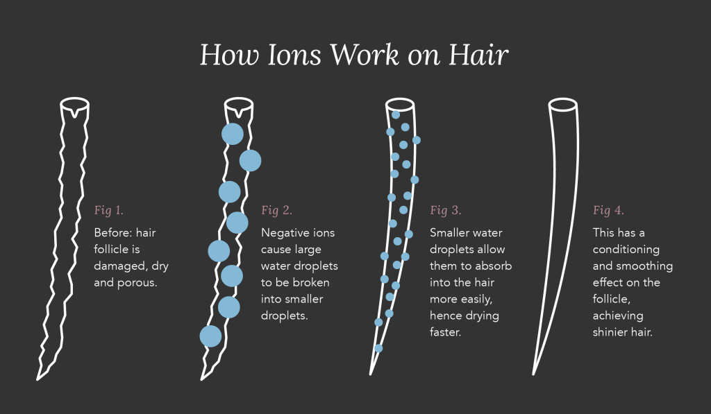 Со помош на негативните јони се отстранува позитивниот електричен полнеж од косата. Јонската четка за коса го отстранува статичкиот електрицитет од вашата коса само со нежно четкање. Во исто време, негативните јони продираат во секое влакно, целосно го опкружуваат и ги затвораат фоликулите на косата. Ова ја задржува влагата во косата и ја подобрува флексибилноста на косата. Затоа, косата е повитална, посјајна и поздрава. Можете дури и да ја исправите косата со подолго чешлање.